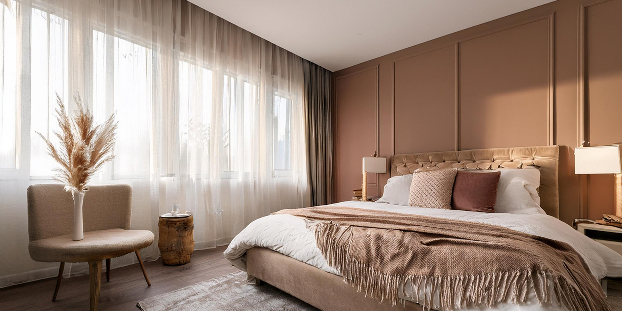Esempi: plaid e cuscini in terracotta o rosso ciliegia per un effetto caldo e accogliente; tende in beige o crema per bilanciare l’intensità dei toni marroni.