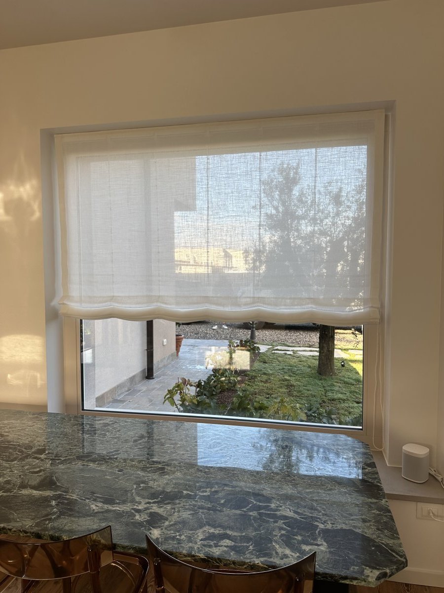 Sotto la vetrata infatti è possibile vedere la tavola da pranzo, il pacchetto grazie al suo movimento verticale permette di posizionare la tenda all'altezza che preferisci.