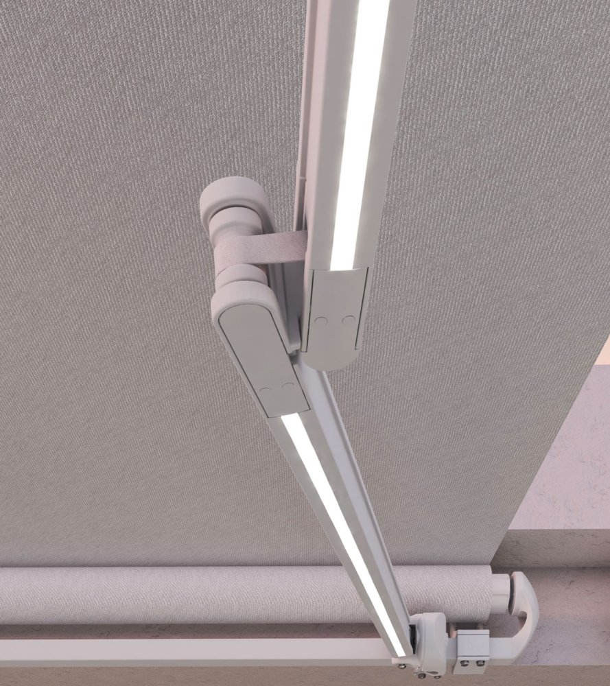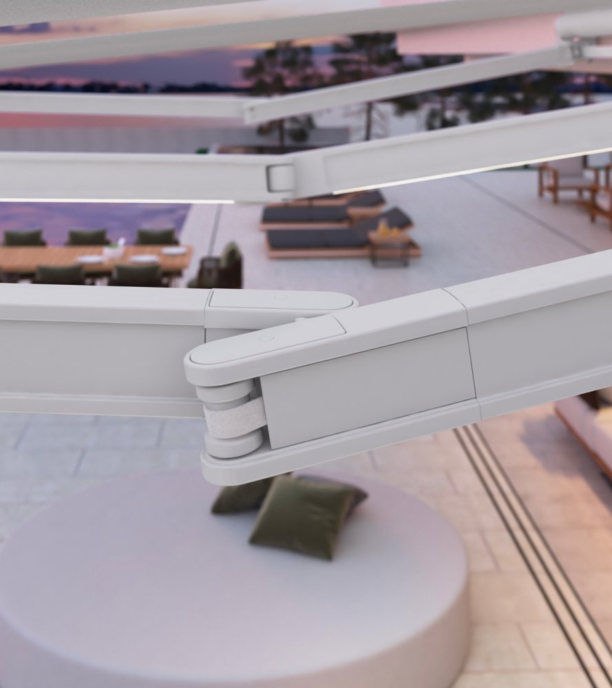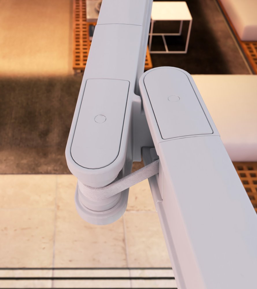 Tenda da sole a bracci motorizzata su barra quadra 40×40 mm. Installazione a parete o a soffitto.